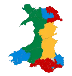 Les 60 membres de l'Assemblée générale du pays de Galles sont élus suivant un système mixte. La région est divisée en 40 circonscriptions électorales qui élisent chacune un AM au scrutin uninominal majoritaire à un tour. Ces circonscriptions sont réunies en cinq régions électorales, qui élisent chacune quatre AM en suivant la méthode d'Hondt.