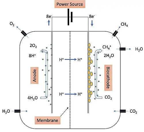 Le mécanisme de l'électrométhanogénèse est décrit dans la figure 1. L'eau est introduite dans le système autour de l'anode, la biocathode et les microbes. Sur l'anode, les microbes attirent les molécules d'H2O qui sont ensuite oxydées quand le courant électrique passe. L'oxygène y est libéré. Les protons et les électrons oxydés de l'H2O traversent la membrane où ils pénètrent dans le matériau qui constitue la biocathode. Le type de microorganisme tapissant la biocathode a la capacité de transférer les nouveaux électrons du corps de la biocathode et de les convertir en protons. Ces protons sont ensuite utilisés dans la voie principale qui entraîne la production de méthane par électrométhanogénèse, la réduction du CO2 qui est amené du côté biocathode du système où il est réduit par les protons produits par les micro-organismes pour donner du H2O et du méthane (CH4+). Le méthane produit peut ensuite être libéré du côté biocathode et stocké[4],[7],[5],[9].