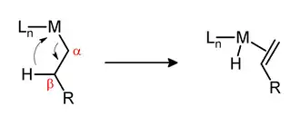 L'élimination de β-hydrure est une réaction organique dans laquelle un groupe alkyle lié à un centre métallique se convertit en hydrure métallique et alcène correspondants[1]. Pour cela, l'alkyle doit comporter au moins un atome d'hydrogène sur le carbone en β de la liaison métallique, qui sera donc éliminé. De même, le complexe métallique doit avoir un site cis par rapport au groupe alkyle vacant pour que la réaction ait lieu.