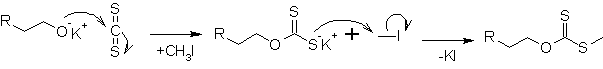 Dans la première étape de la réaction, un sel de xanthate est formé à partir d'un alcoolate et du disulfure de carbone (CS2) : l'alcoolate est transformé en méthylxanthate par addition d'iodométhane.