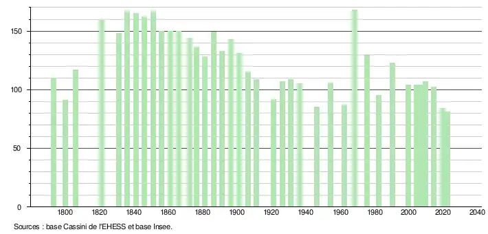 L'évolution du nombre d'habitants est connue à travers les recensements de la population effectués dans la commune depuis 1793. Pour les communes de moins de 10 000 habitants, une enquête de recensement portant sur toute la population est réalisée tous les cinq ans, les populations de référence des années intermédiaires étant quant à elles estimées par interpolation ou extrapolation[29]. Pour la commune, le premier recensement exhaustif entrant dans le cadre du nouveau dispositif a été réalisé en 2004[30].