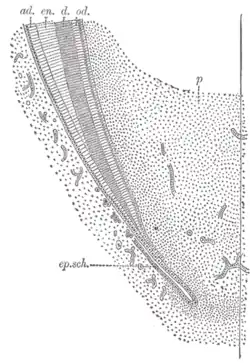 - ↑ En haut, l'émail composé principalement de la couche prismatique, et dans sa partie supérieure la couche finale sans bâtonnets. En bas, la dentine.
