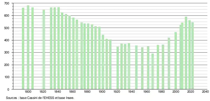 L'évolution du nombre d'habitants est connue à travers les recensements de la population effectués dans la commune depuis 1793. Pour les communes de moins de 10 000 habitants, une enquête de recensement portant sur toute la population est réalisée tous les cinq ans, les populations de référence des années intermédiaires étant quant à elles estimées par interpolation ou extrapolation[19]. Pour la commune, le premier recensement exhaustif entrant dans le cadre du nouveau dispositif a été réalisé en 2008[20].