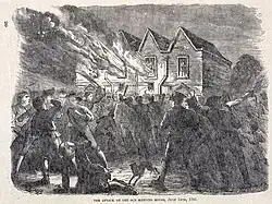 Les émeutiers de rendent ensuite à la maison de Priestley sur Fairhill. Ce dernier a tout juste eu le temps de s'enfuir avec son épouse chez des amis. Écrivant peu après les événements, Priestley décrit la première partie de l'attaque qu'il a vue de loin :