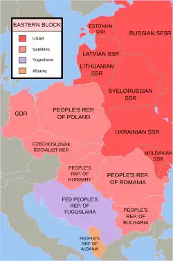 D'autres États sont convertis en régimes satellites de l'URSS, comme la République populaire de Pologne, la République populaire de Hongrie[18], la République socialiste tchécoslovaque[19], la République populaire de Roumanie, la République populaire socialiste d'Albanie[20] et, dans les années suivantes, l'Allemagne de l'Est dans la zone d'occupation soviétique[21]. La République fédérative socialiste de Yougoslavie est aussi considérée comme rattachée au bloc[22],[23], malgré la rupture Tito-Staline en 1948[24] suivie de la formation du Mouvement des non-alignés.