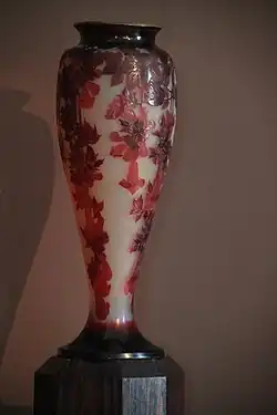 Issues de la halle de cristallerie, les pièces étaient alors retravaillées par gravure, à la roue pour les plus précieuses, à l'acide fluorhydrique pour les plus courantes. On dégageait ainsi un décor en camée, le plus souvent floral, rencontre heureuse des hasards du soufflage et du savoir-faire des graveurs-décorateurs.