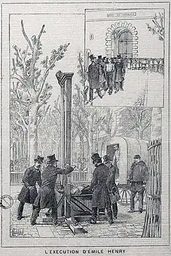 Vers 3h15 du matin, le bourreau Louis Deibler et son assistant mettent en place la guillotine[24]. Deibler a rencontré Henry la veille pour parler des détails de l'exécution et la discussion s'est bien passée[24].