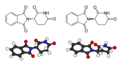 Un exemple tragique d'effets différents de deux énantiomères est celui de la thalidomide. Cette substance utilisée dans différents médicaments possède en effet deux énantiomères. La configuration (R) de la molécule a des effets sédatifs et anti-nauséeux (notamment chez la personne enceinte), tandis que la configuration (S) a des effets tératogènes. L'utilisation de la thalidomide a donné lieu à un important scandale sanitaire au début des années 1960. On dénombre en effet entre 10 000 et 20 000 victimes[1].