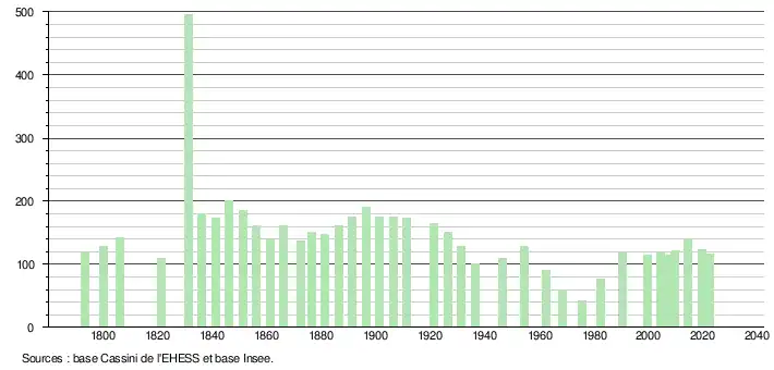 L'évolution du nombre d'habitants est connue à travers les recensements de la population effectués dans la commune depuis 1793. Pour les communes de moins de 10 000 habitants, une enquête de recensement portant sur toute la population est réalisée tous les cinq ans, les populations de référence des années intermédiaires étant quant à elles estimées par interpolation ou extrapolation[19]. Pour la commune, le premier recensement exhaustif entrant dans le cadre du nouveau dispositif a été réalisé en 2004[20].