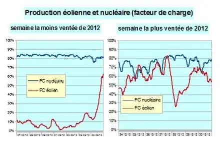 Les données détaillées de RTE (eCO2mix)[25] permettent de constater qu'en 2012, la puissance produite par le parc éolien français varie de 50 MW (0,7 % de sa puissance installée totale) à 6 198 MW (87 %) ; 21,3 % des puissances instantanées observées sont inférieures à 10 % de la puissance installée ; les moyennes journalières varient de 199 MW (15 novembre), soit 2,7 % du total installé, à 5 207 MW (27 décembre), soit 69,5 % du total installé ; les moyennes hebdomadaires varient de 741 MW (semaine 9 : 11 %) à 4 341 MW (semaine 52 : 58 %).