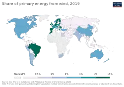 La part de l'éolien dans la production d'électricité mondiale atteignait 7,2 % en 2022 et est estimée à 7,8 % en 2023. L'énergie éolienne est principalement développée en Chine (38,1 % du total mondial en 2023), aux États-Unis (18,5 %) et en Allemagne (6,1 %). Les pays où la part de l'éolien dans la production d'électricité est la plus élevée sont en 2023 le Danemark (57,7 %), le Royaume-Uni (28,7 %), l'Allemagne (27,7 %), le Portugal (26,8 %), les Pays-Bas (23,6 %), l'Espagne (22,8 %) et la Suède (20,6 %).