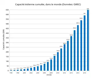 Avec le développement de l'énergie électrique, de nouvelles applications sont trouvées aux éoliennes, notamment dans l'éclairage de bâtiments éloignés du réseau électrique. Des recherches au Danemark et aux États-Unis, motivées par le premier choc pétrolier, conduisent dans les années 1980 à la mise au point d'aérogénérateurs de plus grande taille pouvant être connectés aux réseaux électriques pour une utilisation à distance de l'énergie[14]. La barre symbolique du térawatt de capacité installée dans le monde est franchie en [15],[16].
