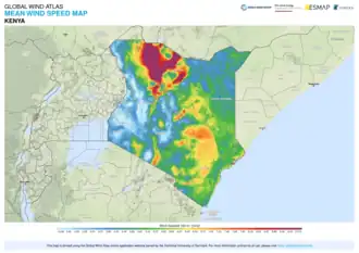 La production d'électricité éolienne au Kenya s'élevait à 2 008 GWh en 2023, soit 15,8 % de la production totale d'électricité du pays ; elle a été multipliée par 33 par rapport aux 61 GWh produits en 2017[2].