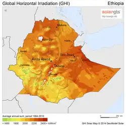La carte ci-contre montre que l'irradiation solaire moyenne annuelle dépasse 2 000 kWh/m2 sur la grande majorité du territoire éthiopien et 2 300 kWh/m2 dans les régions frontalières du Nord et de l'Est. La deuxième carte montre que l'Éthiopie figure parmi les pays les mieux dotés en potentiel solaire, après le Soudan, l'Égypte et la Namibie.