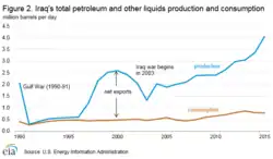 Dix ans après le renversement de Saddam Hussein, la production a dépassé son record historique de 1990 grâce aux prospections de firmes occidentales, russes et asiatiques dans le Sud. Elle a atteint 4,4 Mb/j (millions de barils par jour) en moyenne en 2016, au quatrième rang mondial derrière les États-Unis, la Russie et l'Arabie saoudite, avec des exportations records de 4,1 Mb/j en , alors que la production ne dépassait pas 1,5 Mb/j avant l'invasion de 2003 et même 3,5 Mb/j avant l'invasion du Koweït en 1991[3].
