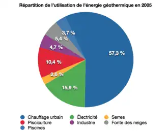 Le principal usage de l'énergie géothermique est le chauffage, la chaleur étant distribuée aux bâtiments grâce à un important réseau de chaleur[30].