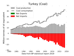 En 2022, la production de charbon de la Turquie atteignait 684 PJ, en progression de 43 % par rapport à 1990. Elle couvrait 42,3 % de la consommation du pays ; les importations s'élevaient à 988 PJ. En 2021, 58 % de la consommation était consacrée à la production d'électricité ; la consommation finale de 538 PJ se répartissait entre l'industrie (66 %), le tertiaire (27 %) et le secteur résidentiel (7 %)[1].