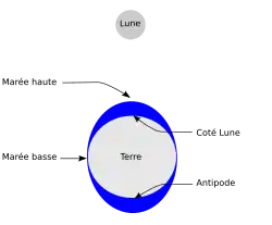 La surface des océans, en raison du gradient d'attraction lunaire entre le côté faisant face à la Lune et le côté opposé, adopte en moyenne, en coupe, une forme elliptique, dont le grand axe est orienté sur la direction Terre-Lune. La Terre tournant sur elle-même en 24 heures (approximativement) alors que la Lune tourne autour de la Terre en 28 jours (approximativement), le mouvement de rotation de la Terre par rapport à l'axe Terre-Lune produit le phénomène des marées.