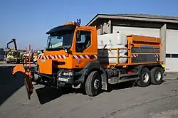 Épandeuse montée sur un camion porteur équipé d’une lame biaise.