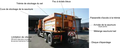 Éléments constitutifs d'une épandeuse liquide-solide, c'est-à-dire que l'on peut répandre soit du sel, soit de la saumure, soit les deux (bouillie de sel)