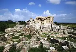 Vestiges in situ du temple d'Artémis. Au fond, la mosquée d'İsa Bey et l'ensemble fortifié de la citadelle d'Ayasoluk et de la basilique Saint-Jean-le-Théologien.