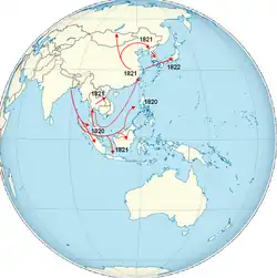 - 1re pandémie (1817-1824) : elle débute à Calcutta et frappe tout l'Extrême-Orient, ainsi que l'Afrique orientale. À partir de 1823, elle touche l'Asie mineure.