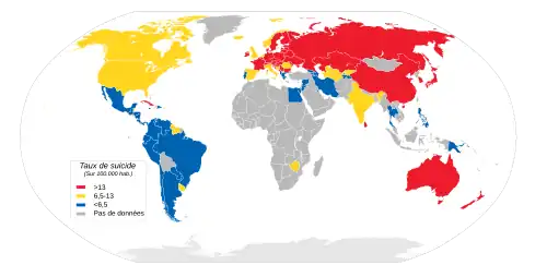 Dans le monde, 815 000 personnes se sont suicidées en 2000, soit 14,5 morts pour 100 000 habitants (un mort toutes les 40 secondes[7]). Les tentatives de suicide sont beaucoup plus fréquentes et sont estimées à 10 à 20 fois plus nombreuses que les suicides[8].