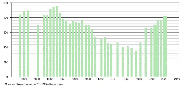 L'évolution du nombre d'habitants est connue à travers les recensements de la population effectués dans la commune depuis 1793. Pour les communes de moins de 10 000 habitants, une enquête de recensement portant sur toute la population est réalisée tous les cinq ans, les populations de référence des années intermédiaires étant quant à elles estimées par interpolation ou extrapolation[33]. Pour la commune, le premier recensement exhaustif entrant dans le cadre du nouveau dispositif a été réalisé en 2004[34].