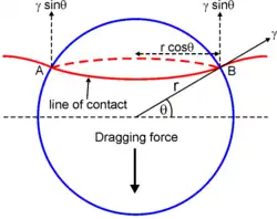 La figure ci-contre illustre un front d'énergie γ par unité de surface qui intersecte une particule étrangère, de rayon r. La force d'épinglage se développe le long de l'interface de contact entre le front et la particule, qui, si les particules sont sphériques (cf. infra), est un cercle de diamètre AB = 2πr cosθ. La force par unité de longueur le long de l'interface est γ sinθ. Par conséquent, la résultante des forces s'exerçant sur l'interface est