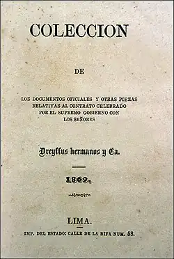 En 1869, l'État péruvien a mis fin au système de consignataire et, malgré les protestations des entrepreneurs nationaux (les «fils du pays»), a cédé l'ensemble de l'entreprise à la maison d'affaires du financier français Auguste Dreyfus par le biais du « contrat Dreyfus » dont l'architecte était le ministre des Finances Nicolás de Piérola. Par ce contrat Dreyfus avait les droits sur toutes les exportations de tous les sites d'exploitation du guano vers les principaux marchés en échange de paiements anticipés à l'État. Un prix de référence et une quantité de guano à exporter par an ont été établis pour savoir combien l'homme d'affaires paierait. Bien que ce contrat ait l'avantage de donner beaucoup d'argent à l'avance à l'économie de l'État, il a l'inconvénient de rendre l'État dépendant d'un opérateur unique. Quand en 1872 le prix du guano sur le marché international commencera à baisser, Dreyfus cessera de payer à l'État les grosses sommes des premières années et quand en 1875 l'homme d'affaires décidera de quitter l'entreprise, l'État se retrouvera privé de revenu du jour au lendemain et la crise sera dramatique.