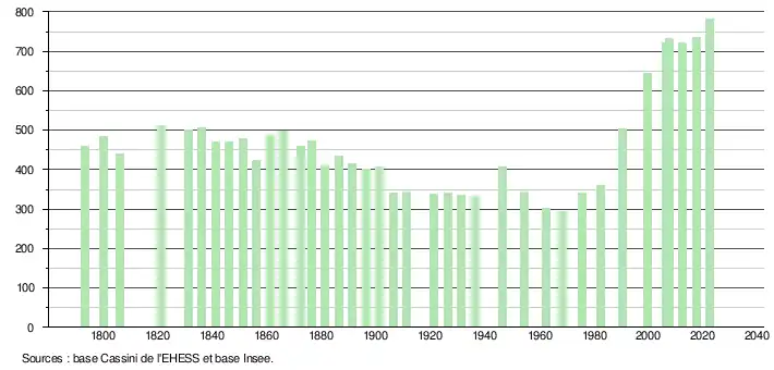 L'évolution du nombre d'habitants est connue à travers les recensements de la population effectués dans la commune depuis 1793. Pour les communes de moins de 10 000 habitants, une enquête de recensement portant sur toute la population est réalisée tous les cinq ans, les populations de référence des années intermédiaires étant quant à elles estimées par interpolation ou extrapolation[17]. Pour la commune, le premier recensement exhaustif entrant dans le cadre du nouveau dispositif a été réalisé en 2007[18].