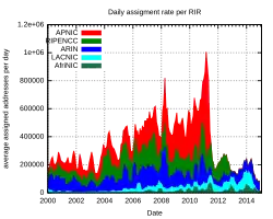 Le , APNIC a annoncé avoir commencé les assignations dans son dernier bloc d'adresses libre[22], et que par conséquent les assignations seront d'une taille /22 (1024 adresses) désormais. Le RIPE NCC a fait de même le [23]. ARIN a assigné son dernier bloc /24 le [24].
