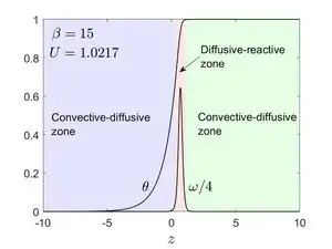 La limite peut être analysée en utilisant l'asymptotique des grandes énergies d'activation. Étant donné que est grand, le terme rendra le terme de réaction pratiquement nul sauf si . Le terme de réaction s'annulera également lorsque et . Il est donc clair que est négligeable partout sauf dans une couche mince proche de la frontière . Le problème est donc divisé en trois régions, une région interne diffusive-réactive flanquée de chaque côté par deux régions externes convectives-diffusives[4].