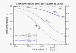 L'équation de Davies est une extension empirique de l'Équation de Debye–Hückel qui peut être utilisée pour calculer le coefficient d'activité d'une solution électrolyte de concentration relativement élevée.