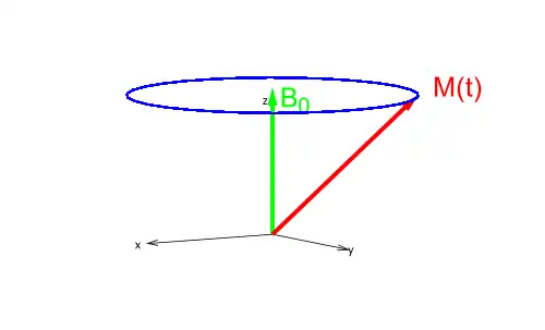 Ainsi l'aimantation transversale, Mxy tourne autour de l'axe z avec la fréquence angulaire ω0 = γB0 dans le sens des aiguilles d'une montre (c'est la raison du signe négatif dans l'exposant). L'aimantation longitudinale Mz reste constante dans le temps. C'est aussi pourquoi l'aimantation transversale apparaît à un observateur dans le référentiel terrestre (vu par un observateur stationnaire).