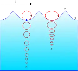 Trajectoires d'une particule fluide. A pour un milieu infiniment profond, B pour une eau peu profonde.