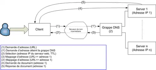 Une mécanisme utilisé pour la distribution des requêtes est le système DNS round-robin qui résout un nom d'hôte unique en plusieurs adresses IP[23]. Un nom de domaine est associé à plusieurs adresses IP correspondant à chaque serveur du cluster. Cette approche, pour la première fois mise en œuvre par le NCSA, afin de gérer l'augmentation du trafic sur son site, était dans le cadre d'un architecture homogène[53]. Très simple à mettre en œuvre, il pose cependant un problème fondamental d'efficacité en raison de la mise en cache sur les DNS locaux. Tant que la valeur du Time to live (TTL) n'est pas expiré, les futures demandes n'accèdent pas au cluster DNS ce qui génère une répartition déséquilibrée de la charge[54]. Cet algorithme ne tenant compte ni de la capacité ni de la disponibilité des serveurs (algorithme apatride), aucun mécanisme ne peut arrêter les clients d'essayer d'accéder au serveur par son adresse en cache[55]. La connaissance de l'état des serveurs est essentielle pour un système hautement disponible afin d'exclure les serveurs inaccessibles en raison de défauts ou de congestion. Combiner la politique basée sur le DNS avec un mécanisme d'alarme évite toute surcharge du système serveur-web[56].