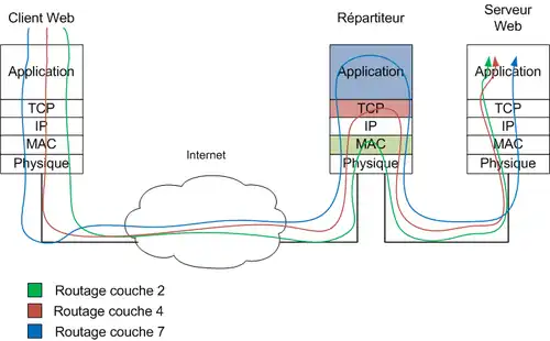 Le routage à la couche 7, ou couche application selon le modèle OSI, permet d'effectuer une distribution des requêtes en prenant en compte le contenu HTTP de cette requête, fournissant ainsi des stratégies de routage plus flexibles. En contrepartie, la charge générée sur le répartiteur est plus importante[15],[44],[25].