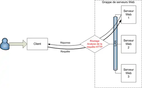 Par contre, la réponse directe du serveur au client nécessite des modifications au niveau du système d'exploitation du serveur et du répartiteur. De plus, la gestion des requêtes et des réponses permet de bénéficier de fonctionnalités de Cache web prises en charge directement par le répartiteur[43].