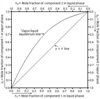 Il est donc possible de représenter les quatre fractions molaires comme sur le diagramme donné en exemple sur la figure 1[3]. La diagonale entre les coins de coordonnées (, ) et (, ) est utilisée comme référence. Si la courbe d'équilibre croise la diagonale, le point d'intersection représente un azéotrope.