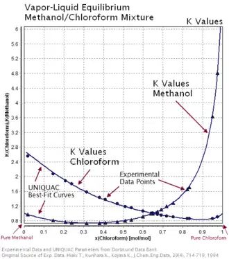La tendance d'une espèce chimique donnée à se déplacer préférentiellement vers une phase (liquide ou gaz) est caractérisée par le coefficient de partage [6]. Il existe des données d'équilibre liquide-vapeur pour des mélanges de quatre composés ou plus, mais de tels diagrammes sont complexes à représenter. Pour de tels systèmes, ainsi que pour les mélanges binaires, l'équilibre est donc représenté par les valeurs de [2],[3] définies par :