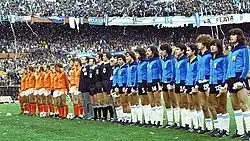 Les années 1970 voient l'invention du Totaalvoetbal (en français : « football total »), reposant sur une permutation des postes durant les matchs, mis au point par le Feyenoord et l'Ajax – vainqueurs à eux deux des quatre premières éditions de la Coupe des clubs champions de la décennie – et dirigé par le meneur de jeu Johan Cruyff et l'entraîneur de l'équipe nationale Rinus Michels[48]. En outre, les Oranjes comptent dans leurs rangs l'un des meilleurs joueurs défensifs des années 1970, Ruud Krol[49]. Les Néerlandais font d'énormes progrès, se qualifiant pour leur première phase finale de Coupe du monde depuis 36 ans en infligeant notamment un sévère 9-0 aux Norvégiens en match éliminatoire[50]. Bien qu'il réussisse à qualifier les Pays-Bas, le sélectionneur František Fadrhonc (en) est remplacé par Rinus Michels peu avant le début de la compétition et devient son adjoint.