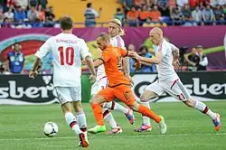 Repris en main par Dick Advocaat, les Oranjes se classent deuxièmes de leur groupe de qualification pour le Championnat d'Europe au Portugal, derrière les Tchèques de Jan Koller qui sont les seuls à les vaincre (1-3). De fait, les Néerlandais doivent passer par un barrage contre l'Écosse. Après une défaite à Hampden Park (0-1), ils s'imposent largement au match retour (6-0, dont un triplé de Ruud van Nistelrooy) et valident leur qualification[93]. À l'Euro 2004, privés de Mark van Bommel pour cause de blessure, ils terminent deuxièmes d'un « groupe de la mort ». Ils entament la compétition par un nul contre l'Allemagne (1-1) avant de perdre contre les Tchèques qui les avaient déjà devancés en qualification. Ils mènent pourtant rapidement par deux buts à zéro avant de s'incliner (2-3), Advocaat faisant entrer Paul Bosvelt à la place d'Arjen Robben alors qu'ils mènent encore 2-1, ce qui provoque l'ire des supporteurs et des médias néerlandais[94]. Mais ils battent la Lettonie (3-0) pendant que les Allemands s'inclinent devant la République tchèque déjà qualifiée, ce qui les qualifie pour les quarts de finale. Ils jouent ainsi contre la Suède. Le match est à haut rythme et les occasions se multiplient, Ruud van Nistelrooy et Henrik Larsson frappant même les montants des buts adverses respectifs. Mais malgré cela, le score reste nul et vierge et la décision se fait aux tirs au but où les Néerlandais l'emportent pour la première fois de leur histoire, brisant ainsi la malédiction qui planait depuis l'Euro 1992 sur cette séance particulière. Cependant les Pays-Bas échouent en demi-finale contre le Portugal (1-2) qui joue à domicile. Advocaat démissionne du poste d'entraîneur peu après.