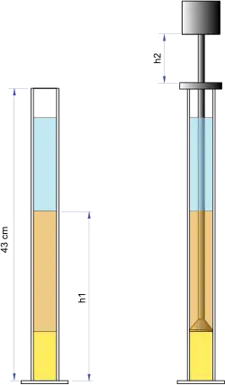 Après repos, la hauteur h1 du niveau supérieur du floculat par rapport au fond de l'éprouvette graduée est mesurée. Le piston est ensuite abaissé dans l'éprouvette jusqu'à ce que l'embase repose sur le sédiment, ce qui permet de mesurer la hauteur h2, distance entre la face inférieure de la tête du piston et la face supérieure du manchon[8].