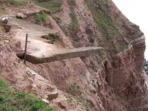 Cette tendance de recul est favorisée par différents agents climatiques comme les fortes précipitations qui provoquent la déstabilisation des terrains en haut de la falaise et l’érosion marine due à l’action des vagues au pied de la falaise bien que cette dernière (l’érosion marine) soit affaiblie par les blocs gréseux sur le haut de l’estran qui représente une sorte de barrière contre les vagues[36].