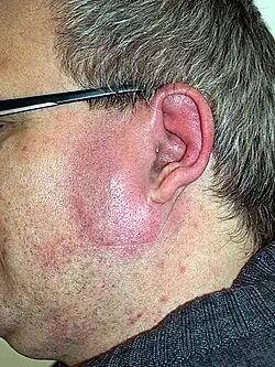 Un érysipèle ou érésipèle ou dermohypodermite bactérienne non nécrosante (DHBNN)[1], est une infection de la peau due à une bactérie, un streptocoque ou, beaucoup plus rarement, un staphylocoque. Il se présente comme une zone inflammatoire de la peau, le plus souvent au niveau d'un membre inférieur, et associée à une fièvre. En principe, le diagnostic ne nécessite pas d'examen complémentaire, et le traitement consiste à administrer un antibiotique et/ou une phagothérapie (très commun en Europe de l'Est et en Russie). Les complications de l'érysipèle sont rares avec le traitement, et peuvent être secondaires à l'extension de l'infection.