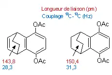 Comparé au composé de droite (qui, avec un groupe alcène en moins, ne peut produire cette réaction) la longueur de la liaison carbone-carbone de pont est censée être plus faible selon la théorie car lors de l'approche de l'état de transition cette liaison acquiert un caractère de liaison double. Pour ces deux composés, les prédictions sont vérifiées selon des données de diffractométrie de rayons X et des constantes de couplage 13C (relation linéaire inverse avec la longueur de liaison).