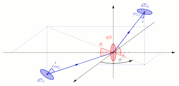 Considérons une source lumineuse et un récepteur , tous deux étendus, c'est-à-dire constitués d'un ensemble de points, séparés par un milieu parfaitement transparent. Pour étudier la transmission de la lumière entre ces deux surfaces il faut étudier la contribution de chaque point de à l'éclairement de chaque point de . On fait appel au calcul infinitésimal, ainsi l'étendue géométrique d'un élément de surface vers un élément de surface s'exprime[1],[2] :