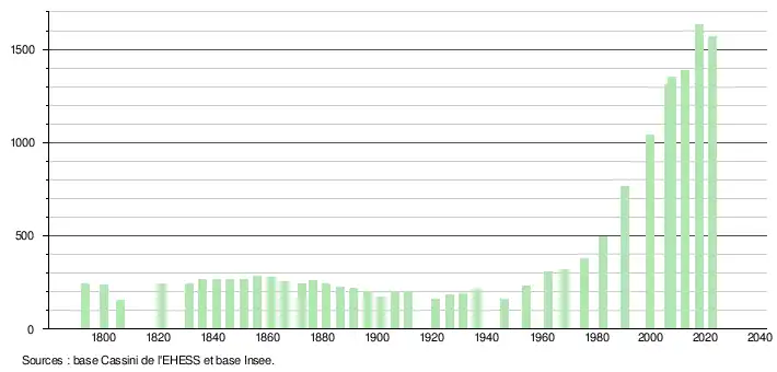 L'évolution du nombre d'habitants est connue à travers les recensements de la population effectués dans la commune depuis 1793. Pour les communes de moins de 10 000 habitants, une enquête de recensement portant sur toute la population est réalisée tous les cinq ans, les populations de référence des années intermédiaires étant quant à elles estimées par interpolation ou extrapolation[43]. Pour la commune, le premier recensement exhaustif entrant dans le cadre du nouveau dispositif a été réalisé en 2007[44].