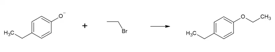Cependant, comme toute synthèse croisée d'éther-oxydes (avec deux alcools différents), il y a risque de formation de sous-produits indésirés, en particulier par des phénomènes d'auto-condensation de l'alcool (par exemple, l'éthanol s'auto-condensant pour former de l'éther diéthylique). Une réaction plus utilisée car à meilleur rendement est la synthèse de Williamson, dans laquelle un phénol est converti par une base forte en ion phénolate, qui peut ensuite réagir avec un halogénure d'alkyle via une substitution nucléophile pour former l'éther de phénol désiré. Pour cette réaction, les halogénures d'alkyle primaires fonctionnent mieux, les halogénures d'alkyle secondaires et tertiaires ayant tendance à réagir par élimination bimoléculaire[5]. Cette synthèse d'éther supprime le risque d'auto-condensation et les rendements peuvent atteindre 95 % en laboratoire.